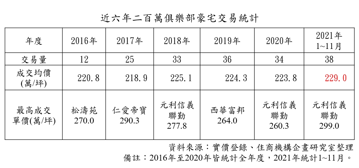 郎美囡說,台北市豪宅市場曾在台北市實施「豪宅稅」,以及政府打房,於2016年房地合一上路後,兩時段的交易大幅緊縮、房價盤整,200萬元俱樂部市場在2016年重挫,全年單價超過200萬元的豪宅交易僅12筆,平均成交單價每坪220.8萬元。