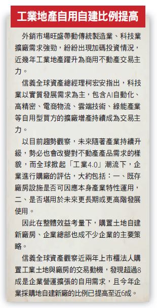 世邦魏理仕台灣資本市場部門主管林敬超指出,受惠於出口表現持續暢旺,自用型買方擴廠增產的剛性需求,已成為推升工業地產交易的主力。