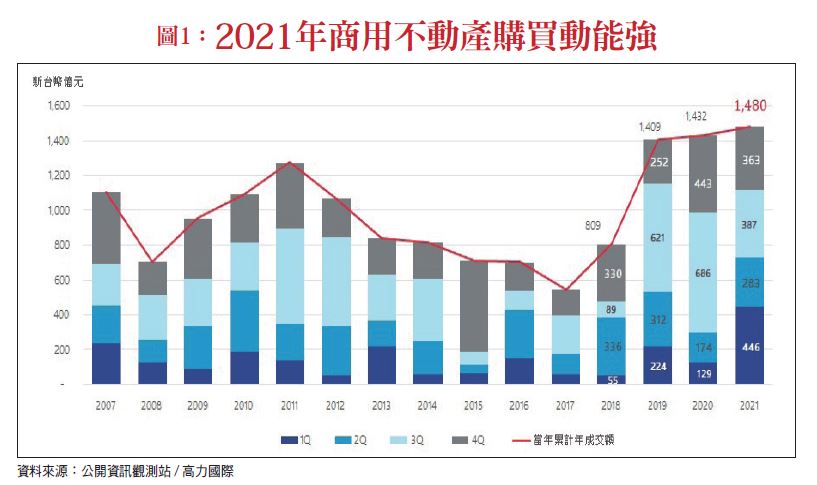 根據第一太平戴維斯統計,二○二一年大型商用不動產交易金額達一七二五億元,年增率為一九%,交易規模寫下歷史新高;即使去年年中疫情升級三級警戒,卻不動搖買方信心,上、下半年交易占比各一半,與二○二○年年初疫情初次出現,交易急凍的情況迥異。