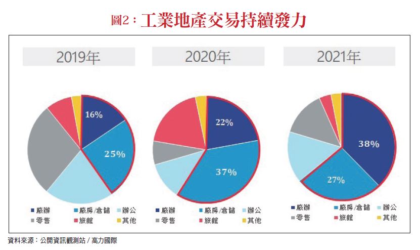 除台北外,新北及台中在產業發展外擴下,辦公廠辦需求也都有望提升;另外,投資台灣三大方案的延長,企業看好台灣環境回流設廠,會持續帶動上下游供應鏈設廠、物流倉儲需求動能,預估二○二二年工業地產仍強勁,但仍要持續關注的變種病毒帶來的威脅以及央行第四波及後續的信用管制政策,都可能造成市場變數。