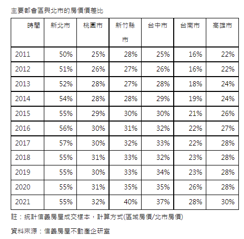 統計信義房屋成交資料,2011年台北市平均房價為每坪54.5萬元,新北市房價僅台北市的一半、桃園、台中市為台北市的1/4、新竹是台北市房價的28%,台南市房價最低僅為台北市的16%,高雄市房價是台北市的22%。