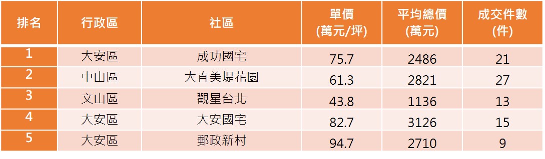 陳金萍表示,台北市前五名的社區中有四個社區是「國宅」,包括「成功國宅」、「大直美堤花園」、「大安國宅」以及「郵政新村」。國宅因建設時間較早,多位於條件優異的地段,周遭生活機能完備,交通建設發達,價格也比周遭物件更親民,是民眾入住市中心的首選。