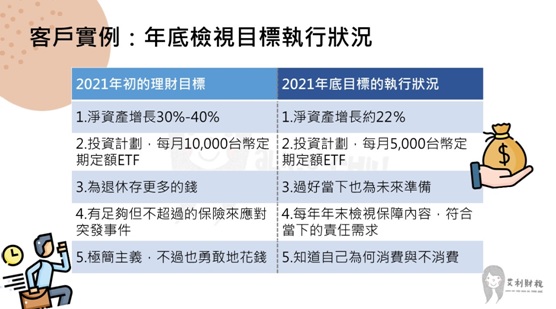 除了上述過程,也會追蹤目前的財務策略,包括緊急預備金準備、退休時間表和其他重要目標,確定目前是否在正確軌道上,或者是否需要進行計劃調整。