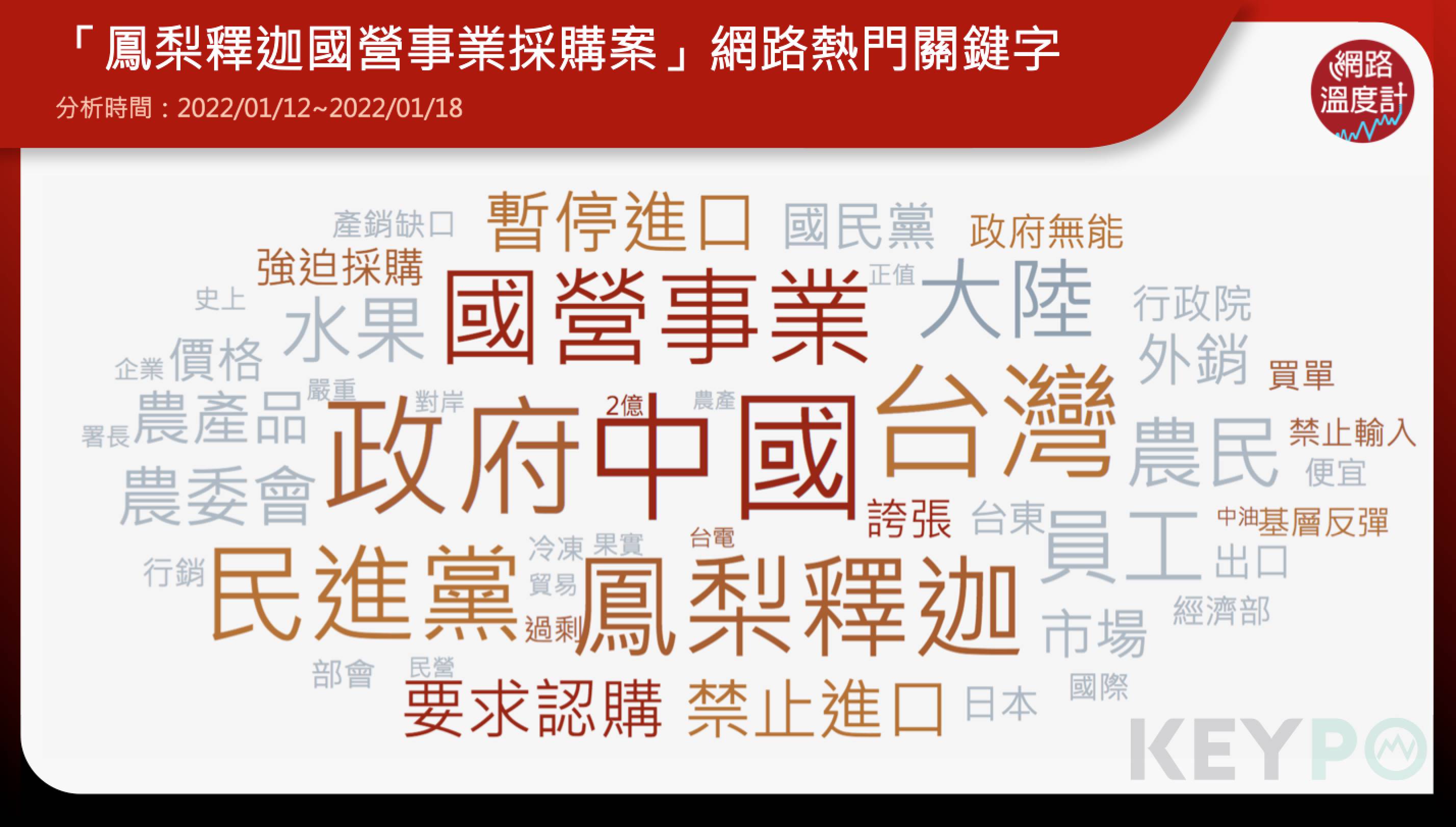 進一步探討「鳳梨釋迦國營事業採購案」,網路熱門關鍵字最大筆除了中國、大陸、禁止進口、暫停進口之外,政府無能、要求認購、強迫採購、中油、基層反彈等等也都在熱門關鍵字榜單中。