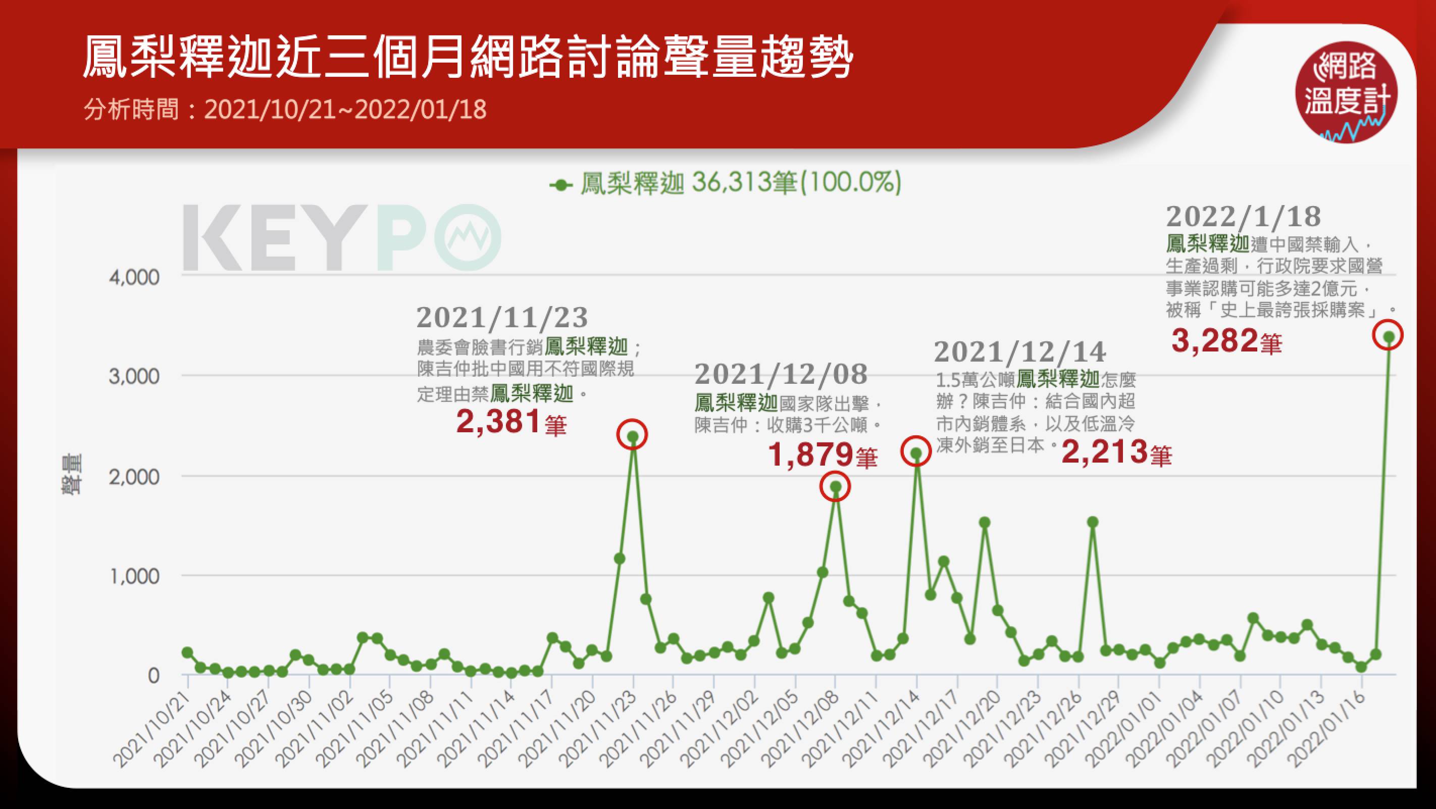 透過《KEYPO大數據關鍵引擎》(2021/10/21~2022/01/18)統計調查,近三個月來,台灣鳳梨釋迦的產銷議題至少創出5~6波明顯的高點,其中討論度最高的就是這一回國營事業認購2億元事件,1月18日消息傳出後,單日聲量達到3,2381筆,網友除了討論產銷失衡、中國禁止輸入之外,同時也有不少企業,直接在粉專上宣布已經認購多少數量,都引起相當多的回應與討論。