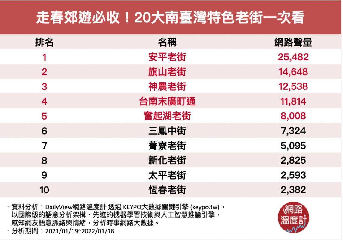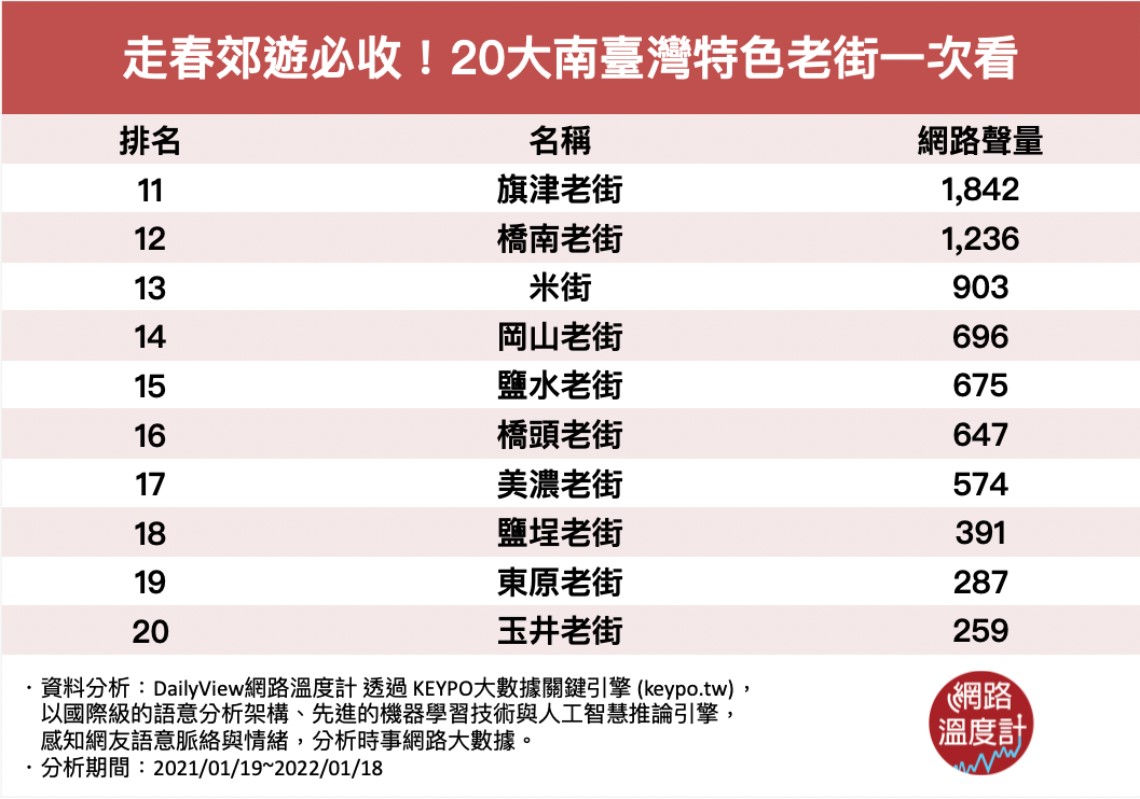 準備好迎接台灣南部老街的魅力了嗎?趕快跟著<DailyView網路溫度計>,透過<KEYPO大數據關鍵引擎>,來看看20大嘉義、台南、高雄、屏東的特色老街吧!