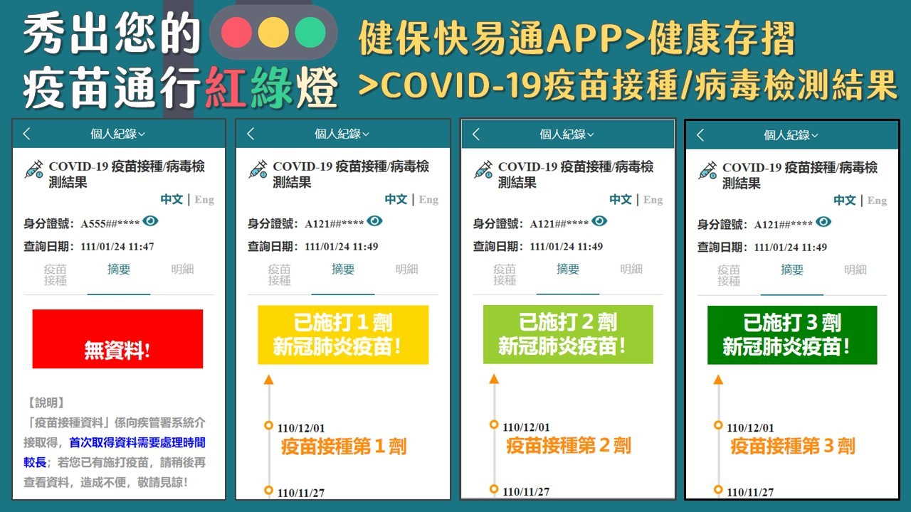 中央流行疫情指揮中心宣布,自111年1月21日起,進入特定場所需配合出示完整疫苗接種紀錄,為迎戰Omicron新型變異株的威脅,衛生福利部中央健康保險署配合政府政策,健保快易通APP在最新版本中,經過顯示介面的調整,現在只要使用健康存摺「COVID-19疫苗接種/病毒檢測結果」,就能清楚透過「紅綠燈」的表達方式,證明目前的疫苗接種情形,並可在國內不同場所通行使用: