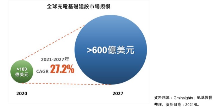 馮紹榮指出,電動車長途行駛與電力耗盡等問題有待解決,也是許多主流企業專注整合充電基礎建設與充電網的完善度,作為電動車發展的基石。根據統計,全球充電基礎建設市場規模在2020年時僅逾100億美元,估計至2027年規模上看超過600億美元,這期間年複合成長率超過27%(見圖),看好長線向上續行。