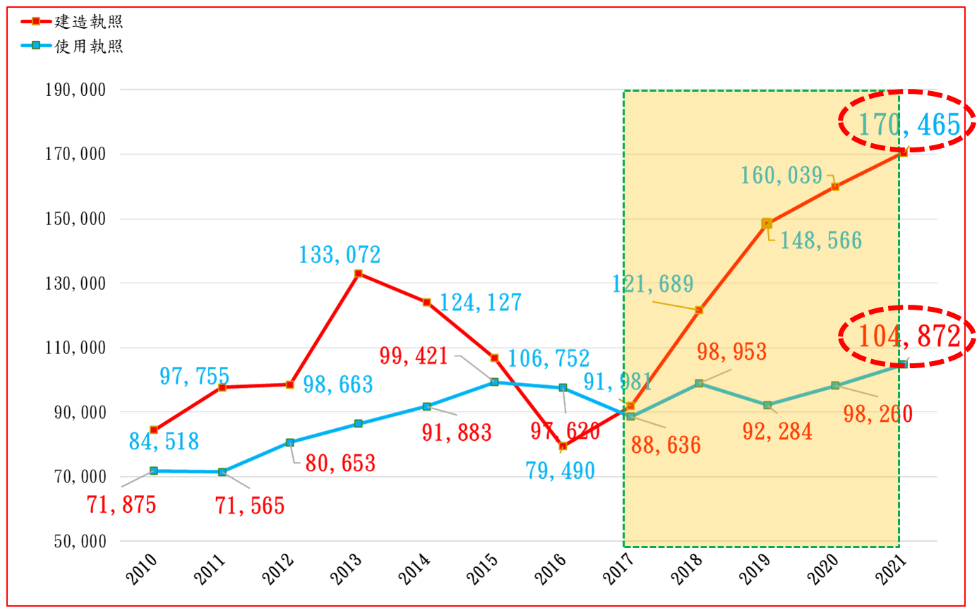 雖然2021年全台都出現價量齊揚情況,惟在近年建造執照累積數量遠大於使用執照情況下,整體市場應會朝「價持平量微增」方向發展;值得注意的是,除交通建設與產業群聚區域之外,雖然有不少地區100%完銷,惟仍有不少蛋白區銷售率未超過60%,而導致新成屋數量愈來愈多之不利發展趨勢。