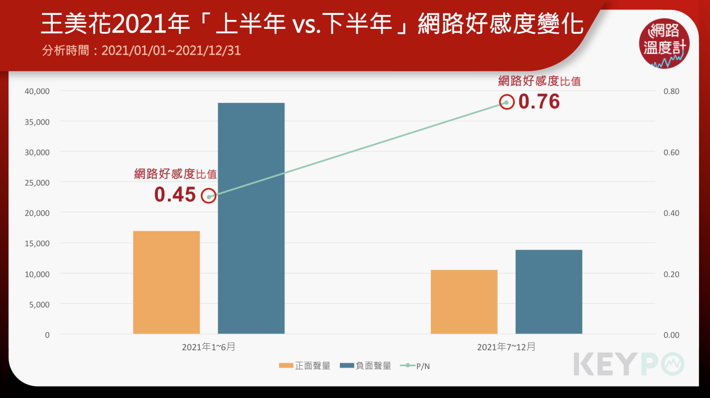 不過,到了下半年7月~12月,王美花為了萊豬、中油三接站等議題,頻頻站上第一線發聲,甚至以經濟部長的身分,參加公投公開說明會進行辯論,雖然有網友不認同王美花的觀點和說法,但有不少網友開始對王美花改觀。這樣的變化,似乎也表現在網路好感度上,王美花上半年好感度比值為0.45,下半年攀升至0.76,換句話說,好感度增加68%。