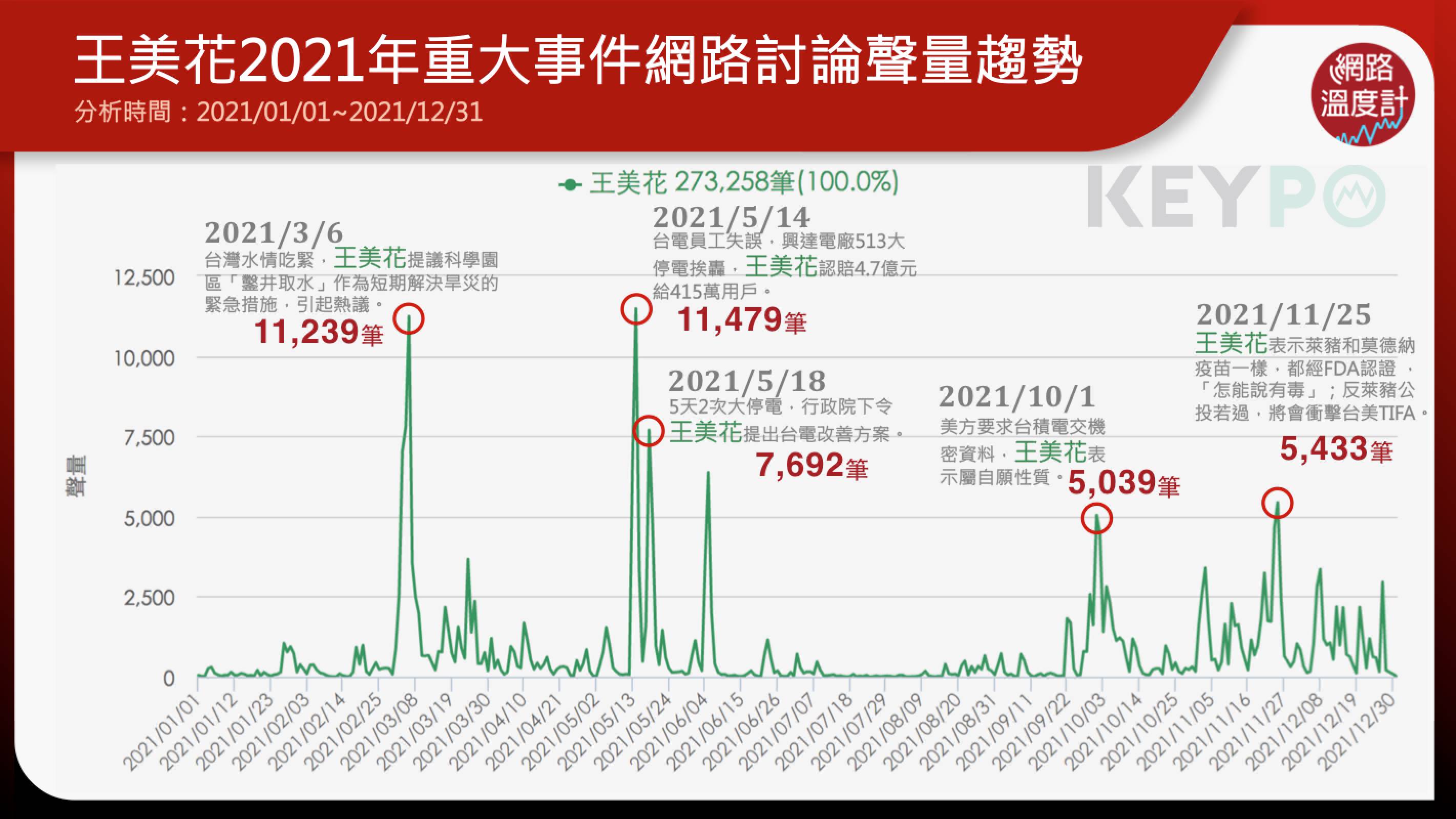 透過《KEYPO大數據關鍵引擎》(2021/01/01~2021/12/31)統計調查,王美花在2021年的幾起大事件,都引起很大的關注,其中網路聲量第一名的是「513興達電廠大停電」事件,當時單日創下1萬1479筆討論;第二名為3月6日,台灣水情吃緊,王美花提議科學園區鑿井取水,作為短期應急措施,引起熱議與爭議,創下1萬1239筆討論。