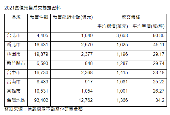 【理財周刊記者顏瓊真報導】信義房屋統計實價預售揭露資料,去(2021)年預售成交揭露金額高達1.28兆元,其中交易金額最高的區域是新北市,總成交金額高達2670億元,交易件數王則是桃園市,預售揭露件數將近2萬筆,成交價格最高的是台北市,平均單價則達每坪90.9萬元。總計去年新北、桃園、台中、高雄等四都,預售成交揭露件數都超過萬筆。
