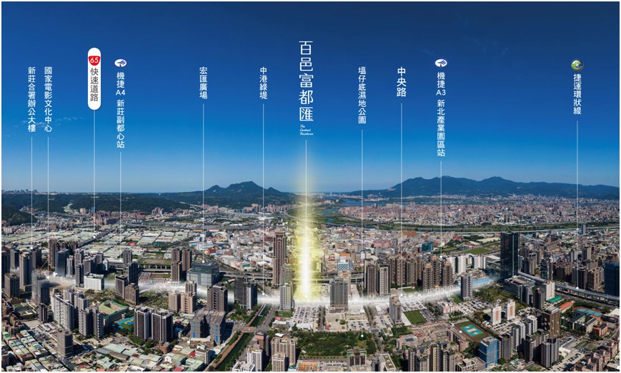 【百邑富都匯】正居宏匯廣場旁,30米中央路大道的燙金中軸特區,A級商辦、i-Tower雲端科技大樓、麗寶總部、宏匯凱悅嘉軒酒店雲集匯集,散步雙捷A3站,擁機場捷運與環狀線幸福站交匯,一線直抵機場國門,2站直達雙子星特區,坐享軌道便利增值,宏匯百貨商圈、中港綠堤、塭仔底濕地公園綠意為鄰,在繁華核心,盡享都會生活饗宴。