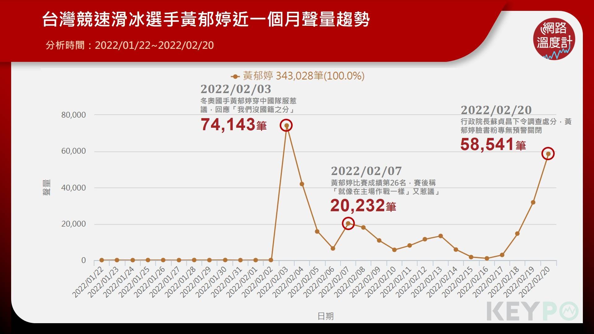 透過《KEYPO大數據關鍵引擎》調查(2022/01/22~2022/02/20),近一個月黃郁婷的網路聲量,2月3日因為賽前穿中國隊服的影片爭議,聲量快速衝高,並創下最高峰,網路聲量共計7萬4143筆。由於觸及兩岸敏感議題,影片曝光後立刻引來網友圍剿,黃郁婷也緊急將影片下架。不過,下架後黃郁婷替自己打發聲,在臉書回應「運動歸運動」、「在運動界裡,我們沒有國籍之分」,非但沒有平息爭議,甚至有點提油救火,成為使風波擴大的關鍵原因,網路上還出現希望取消她國家代表隊資格的聲浪。