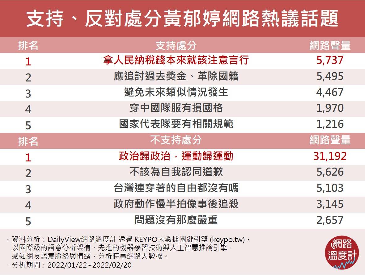 反對處分的討論中,黃郁婷喊出的「運動歸運動」聲量最高,共計3萬1192筆,多數人認同黃郁婷的行為不恰當,但也緩頰「罪不至死」,認為這次事件,基本上已經讓黃郁婷「社會性死亡」。值得注意的是,有不少網友聲援「不該為自我認同道歉」,甚至拿周子瑜「我是中國人」道歉事件類比,翻出總統蔡英文2016年當選時,曾喊出「只要我當總統一天,沒有人需要為他的認同而道歉」,同情黃郁婷遭台灣網友圍剿,就像當初周子瑜被中國網友出征,但也有人酸兩件事情差太多。面對黃郁婷事件,蘇貞昌高喊要調查處分,實際上要怎麼處分尚未定調,就先重新炒熱逐漸平淡的議題,最終會怎麼做,網友都在看。