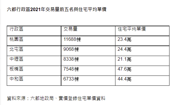 而進一步探究房價,信義房屋據內政部實價登錄資料統計2021年住宅平均單價,桃園區平均單價為23.4萬元、北屯區為24.4萬元、中壢區為21.1萬元、板橋區47.6萬元及中和區44.4萬元。