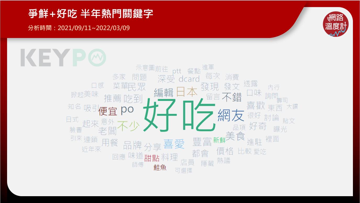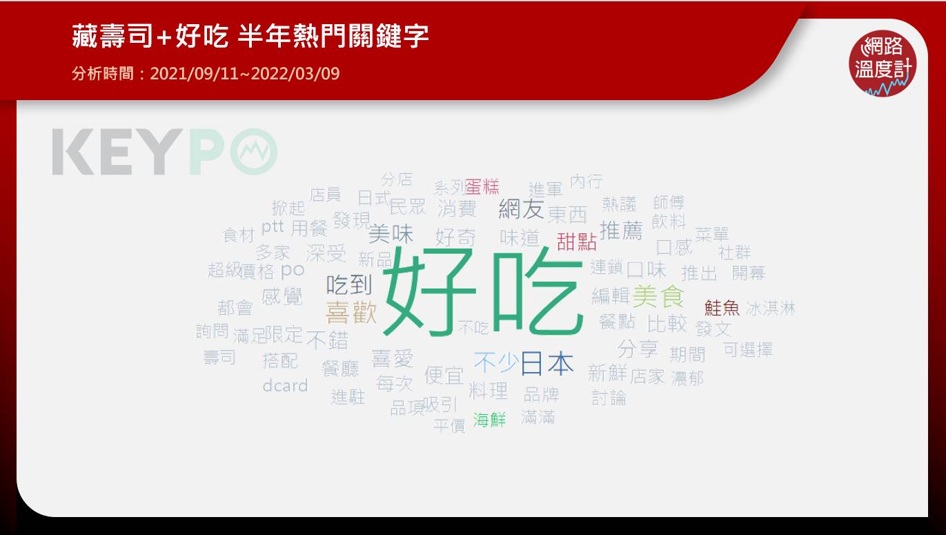 從《KEYPO大數據關鍵引擎》來看爭鮮、壽司郎、和藏壽司三家品牌的網友討論「好吃」的關鍵字,三家都會出現鮭魚,但爭鮮特別有「便宜」兩字的關鍵字,其一盤30元的價格一直是網友所推崇的。而壽司郎和藏壽司的「甜點」和「冰淇淋」,也是網友討論必點必吃的選項之一。