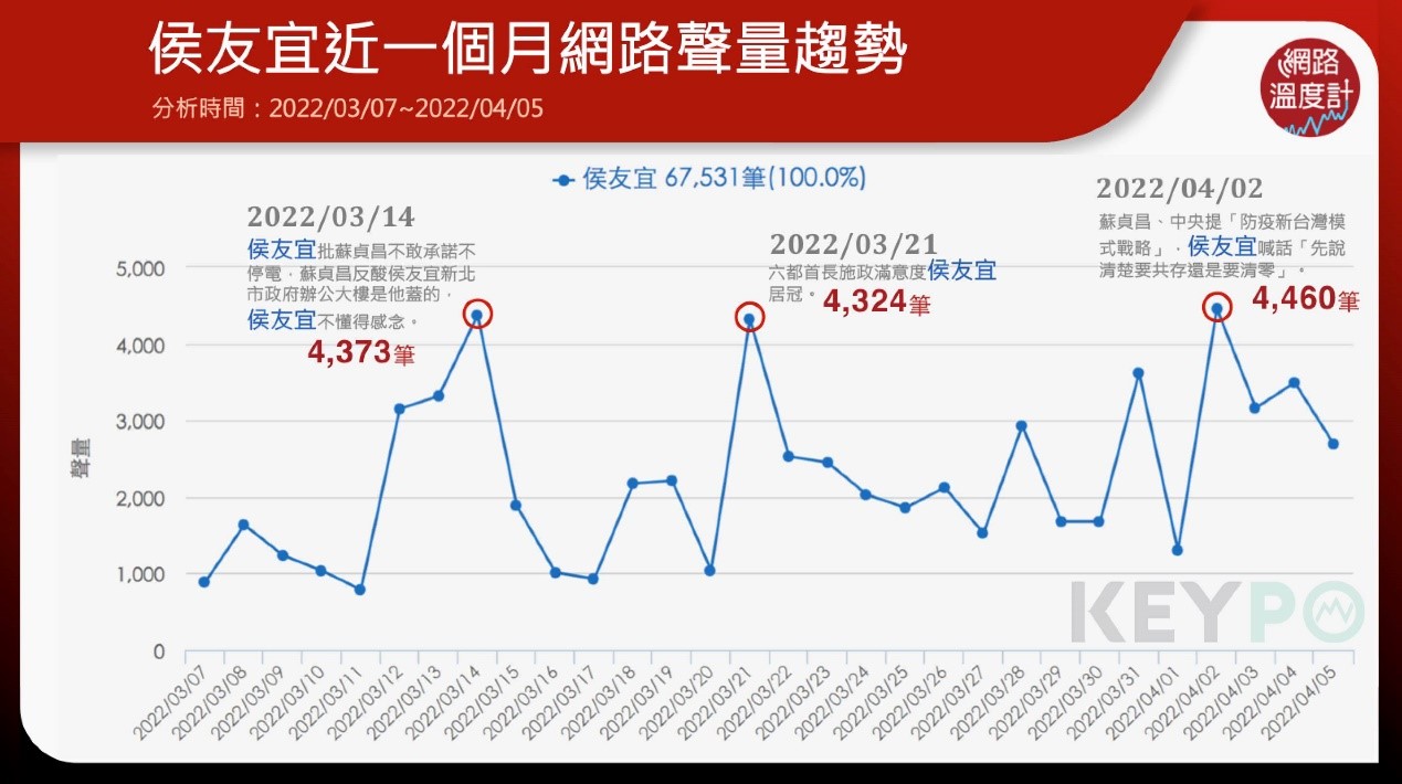 透過《KEYPO大數據關鍵引擎》(時間:2022/03/07~2022/04/05)統計調查,侯友宜近一個月的網路聲量最高峰就落在4月2日,共有4,460筆討論,主要是因為於蘇貞昌提出「防疫政策台灣新模式」,不僅引發外界相當多疑問,到底什麼是台灣新模式,新北市長侯友宜直球拋出問中央「先說清楚要共存還是要清零」,也引來不少討論,新北、中央透過媒體、社群新聞互槓,一來一往炒熱話題。