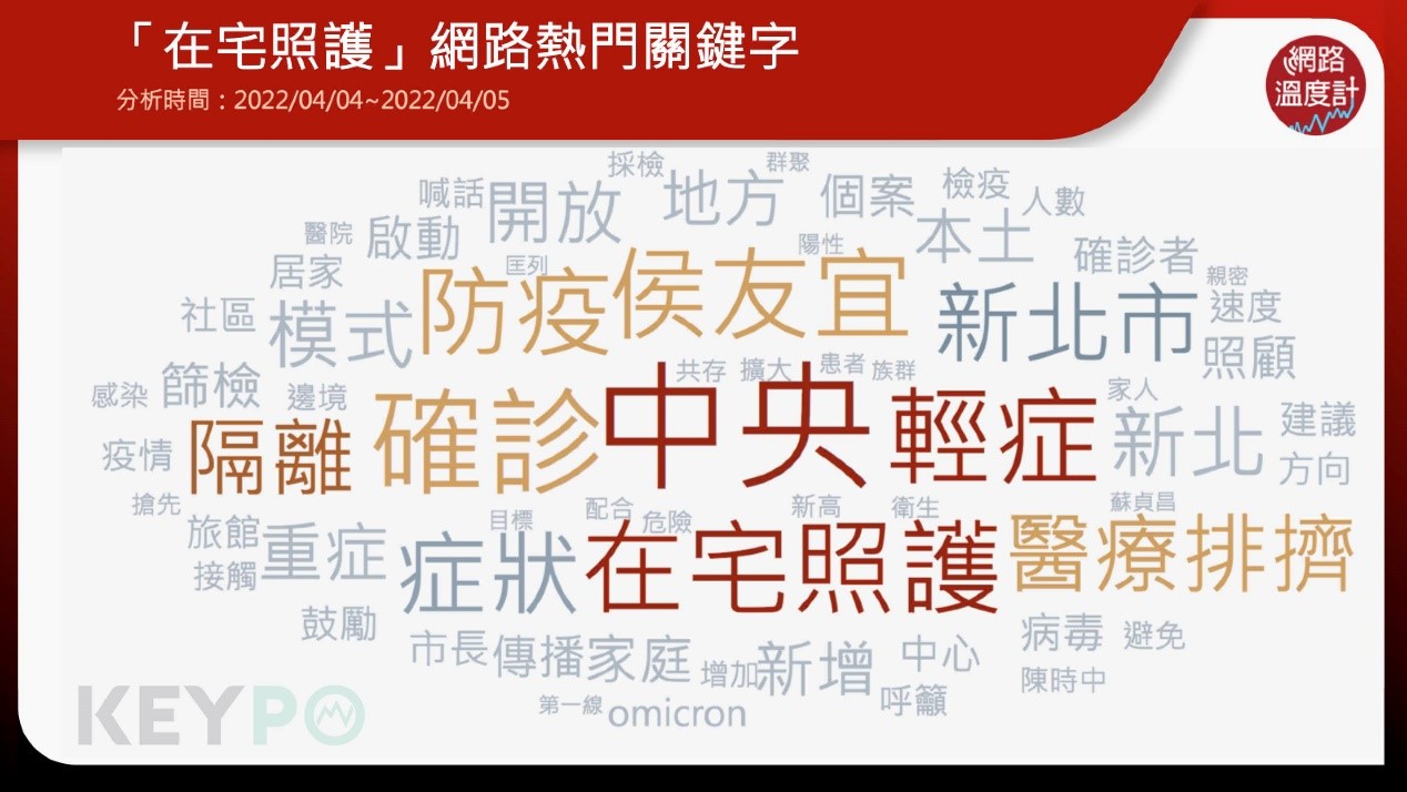 有鑒於近期本土確診人數攀升,侯友宜近日拋出「在宅照護」模式,喊話中央目前大部分確診者多屬輕症或無症狀,因此應提早啟動「在宅照護」模式,以防止排擠醫療量能。從《KEYPO大數據關鍵引擎》(時間:2022/04/04~2022/04/05)分析觀察,網路熱門關鍵字除了「醫療排擠、在宅照護」等等之外,「中央」兩個字的討論熱度同樣很高,顯示出侯友宜和中央之間的互槓,也是網友討論焦點之一。