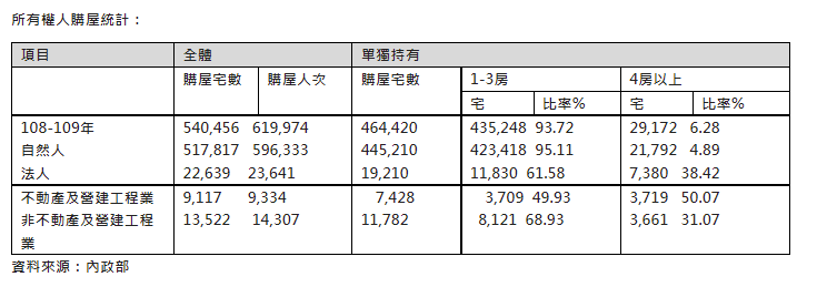 根據官方統計,2019~2020年自然人購屋宅數51.8萬宅,法人購置約2.3萬宅,法人購置佔比約為4%,不過自然人購屋數量以1~3房為最大宗,比例高達95%,但法人購屋數量1~3房比例為62%,有高達38%是購置4戶以上,加上法人擁有多戶住宅人數比例不低,因此被認定囤房現象較為明顯。