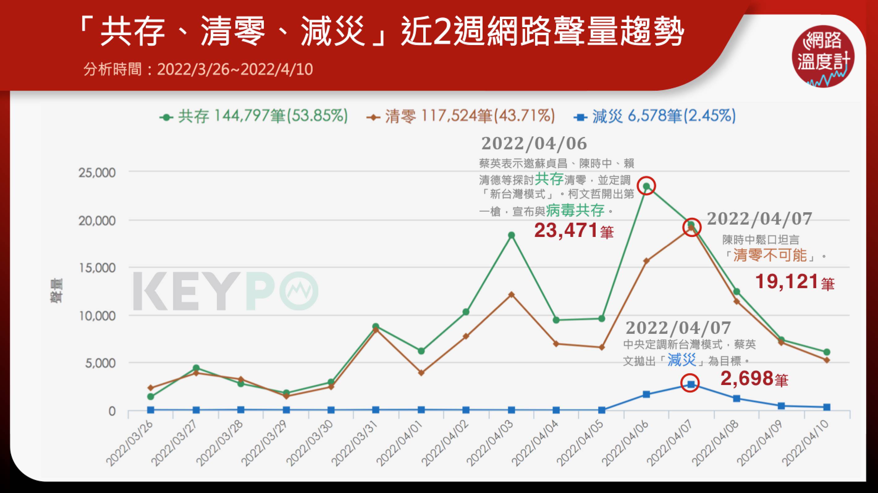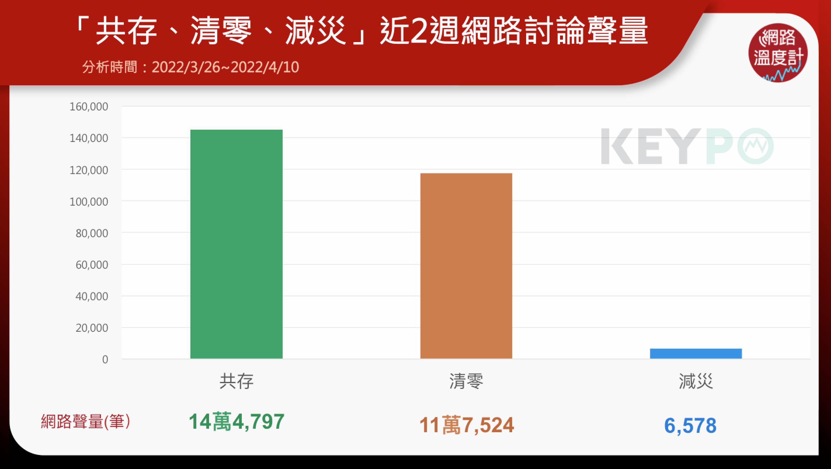 透過《KEYPO大數據關鍵引擎》(時間:2022/03/26~2022/04/10)統計調查,過去近兩週時間,疫情連環爆,不少網友認為清零難度相當高,因此認為未來可能要開啟「與病毒共存」的生活模式,因此,從整體聲量總數來看,「共存」的討論度共有14萬4,797筆,相較於「清零」聲量,明顯多出數萬筆。而府院力拚的「減災」議題,網友的的反應偏冷,是三者之中討論度最低的,減災的議題最大的討論篇幅在4月7日,當日陳時中表示清零已經不可能了,所以未來要朝向「減災」模式,引起許多網友好奇詢問「到底什麼是減災」。