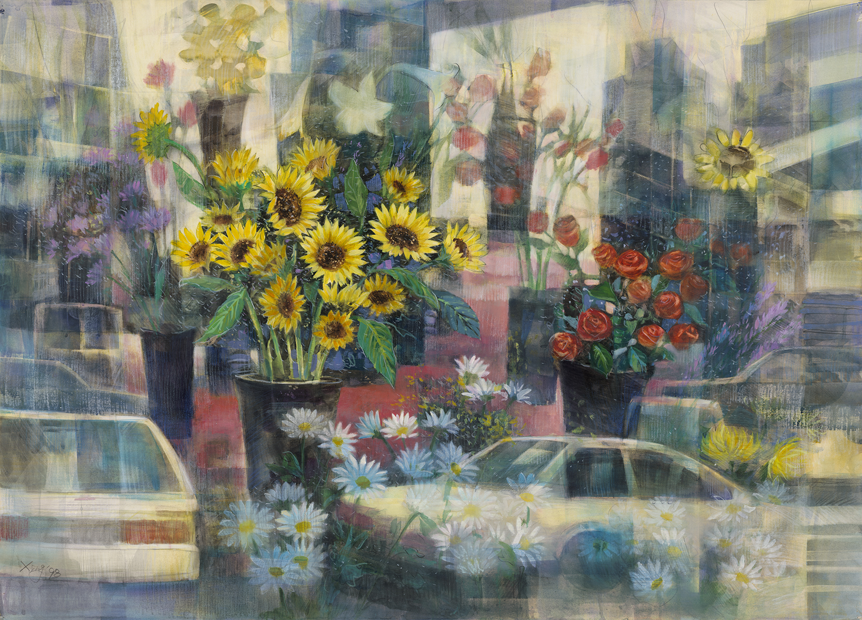 從小在員林花鄉成長的張培均說,「花卉一直是我喜歡且擅長的表現題材,領悟萬物一體之後,運用微觀的星塵透疊法,賦予春花宏觀的生命意義,那是一種周而復始的生生不息,是宇宙無限循環的不可思議!」有人因落花紛飛而神傷,張培均從宏觀角度去讚嘆生命,化作春泥更護花。