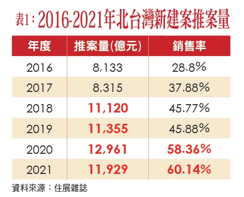 依591房屋網之統計數據,五年來北台灣推案量高達5.5兆元,全台超過7兆元;另外,由數據顯示,2016年北台灣新成屋、預售屋總推案量8,133億元、2017年8,315億元、2018年1.11兆元、2019年1.13兆元、2020年1.29兆元,2021年1.19兆元,惟2016-2019年銷售率均低於50%,及至2020年方才提高至58.36%,2021年再高至60.14%,因此,未來未售餘屋壓力必將逐漸改變市場供需結構!