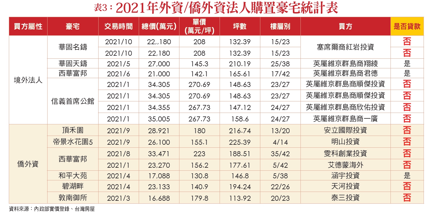 由表三資料顯示,2021年外資/僑外資法人購置豪宅多數以現金支付,無異助長房價幫兇,因此,這次修法擬訂私法人購屋許可制實有其必要性!