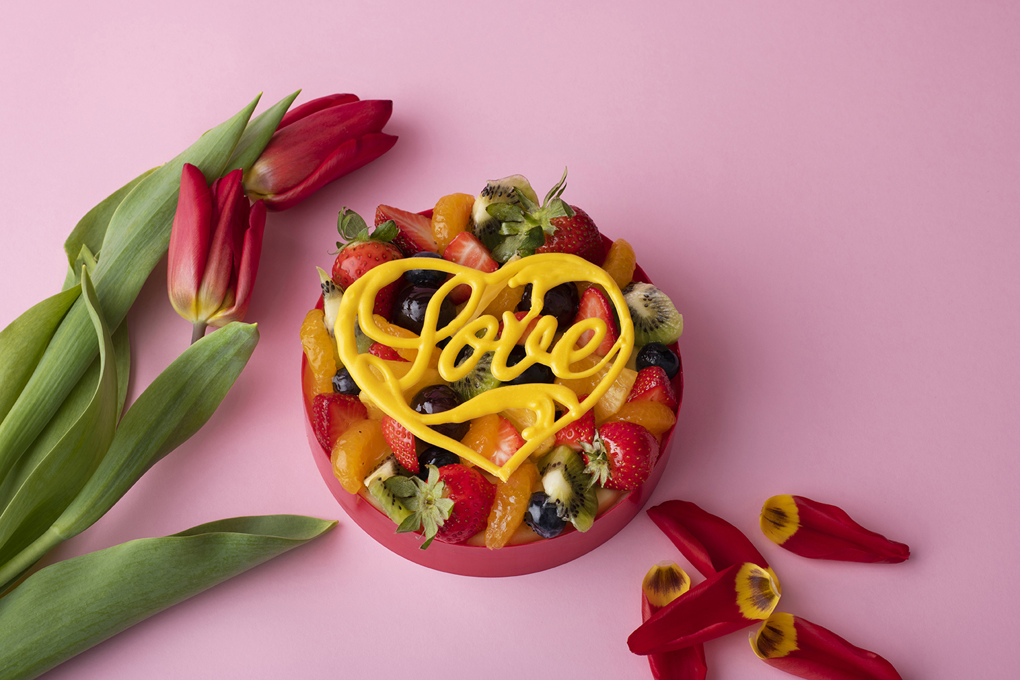 「溫馨慈愛蛋糕」以水果寶盒概念設計,使用台灣季節水果與酥脆派皮的經典組合。何文正主廚選用台灣在地香草莢製成的卡士達,搭配鳳梨、草莓、覆盆子、藍莓等各式水果,整體甜而不膩、新鮮清爽。