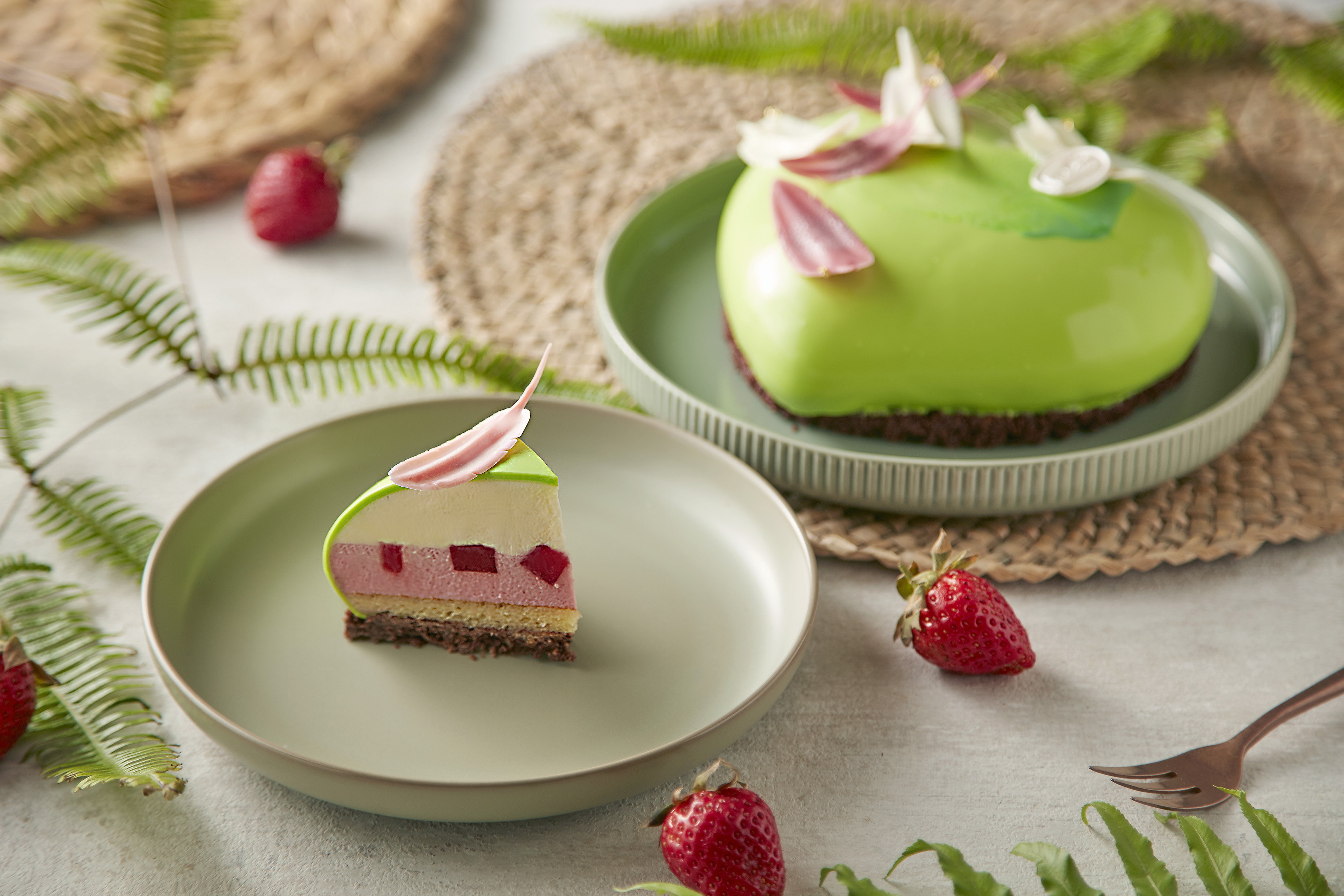 「莓顏綠鏡」草莓慕斯蛋糕,以輕盈軟綿的草莓香草慕斯,搭配手工熬製的草莓庫莉,下層是可可巴瑞脆片以及法國法芙娜70%巧克力製成的酥脆餅乾,最外層則是淋上嫩綠色的法芙娜鏡面巧克力,綴以粉白色的嘉麗寶紅寶石巧克力羽毛,讓媽媽展開幸福笑容就是最天然的美顏濾鏡。