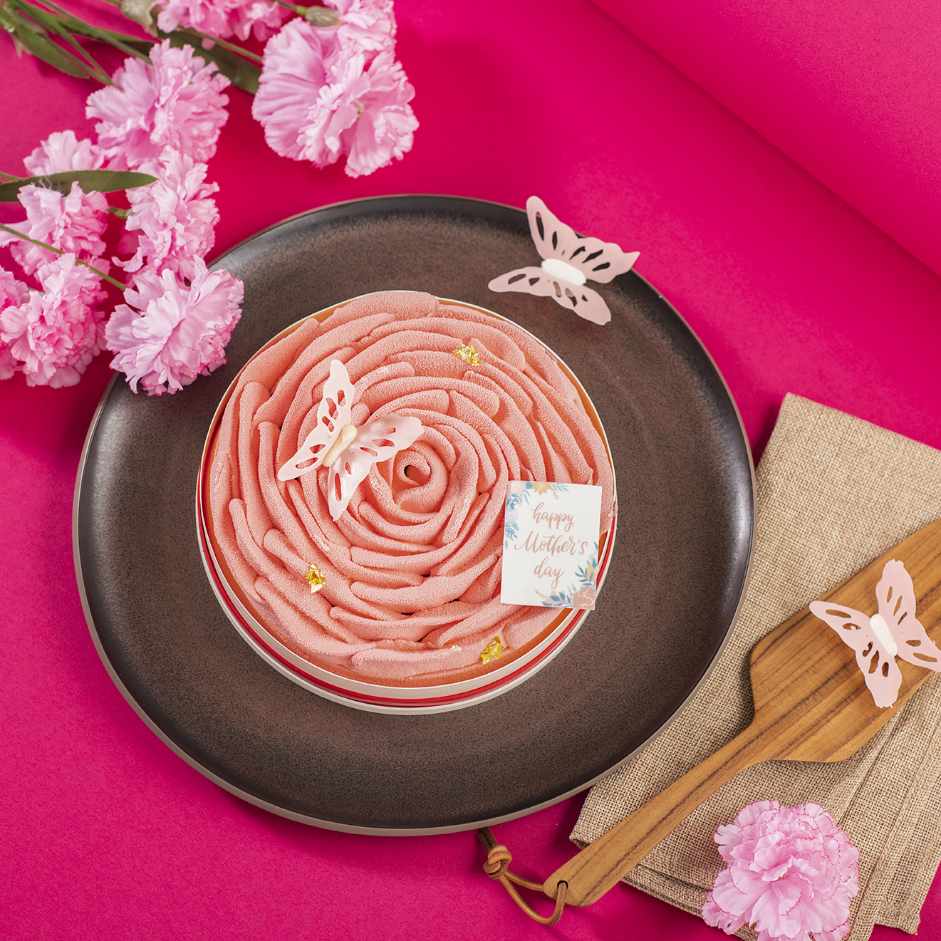 「舞蝶玫瑰園」黑莓香草起司蛋糕(7吋/1,580元),整體造型是以栩栩如生的粉嫩玫瑰花代表著對媽咪的愛,也象徵母親如花綻放的愛,以濃郁的起司蛋糕為主體,乳酪的綿密口感加上底層酥脆餅乾,搭配野莓醬的酸甜果香,酸甜交織的好滋味讓人幸福感爆棚。
