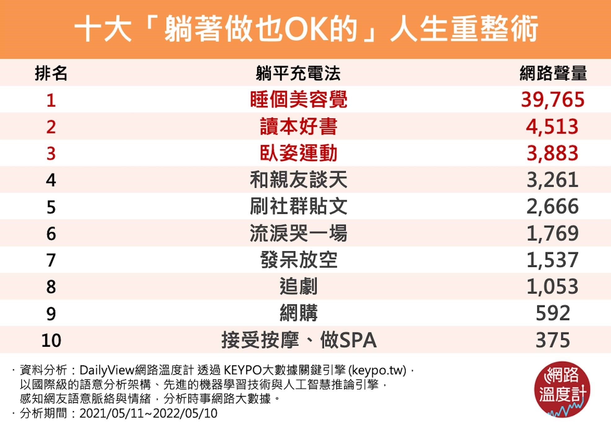 俗話說的好「能坐就不要站、能躺就不要坐」,想給自己加油打氣,躺著總歸是最舒服的,今天就和《DailyView網路溫度計》一起,透過《KEYPO大數據關鍵引擎》,盤點看看最受網友青睞,可以躺著從事的十大人生充電法吧!