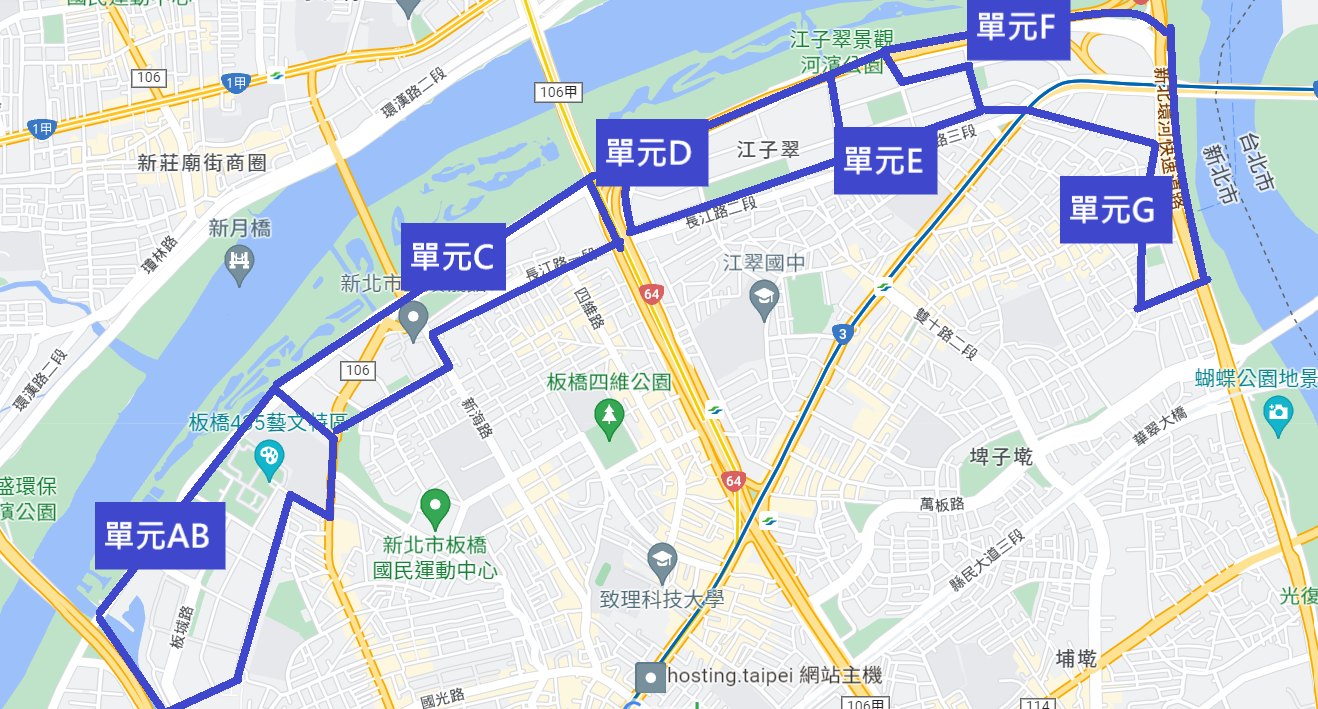 「單元DE」為整個重劃區腹地最大,開發面積約二十六公頃,除了基本的聯外交通,單元DE靠近捷運「江子翠站」及「新埔站」,步行十至十五分鐘就能搭捷運,交通機能更優,選擇更多,且學區江翠國中與江翠國小,綠地石雕公園、農村公園等。