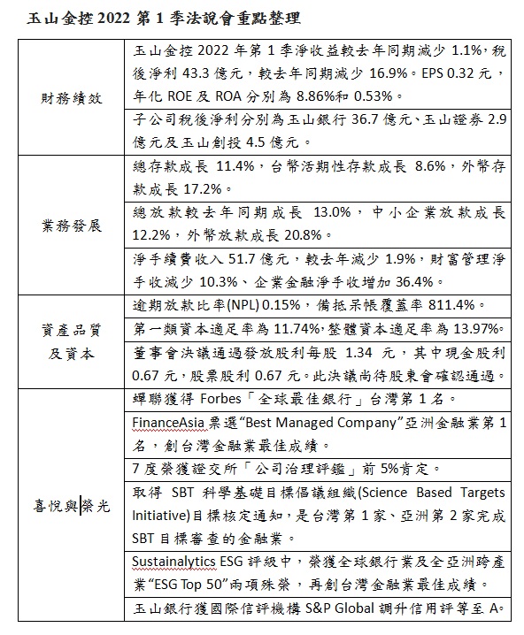 玉山金控25日召開法人說明會,公布2022第1季營運概況及永續金融的發展成果。玉山金本季自結淨收益135.5億元,稅後淨利43.3億元;金控每股稅後盈餘(EPS) 0.32元、股東權益報酬率(ROE) 8.86%、資產報酬率(ROA) 0.53%。