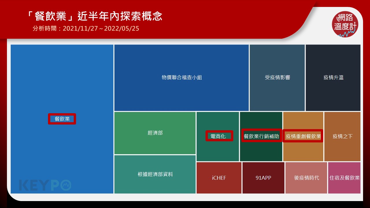 透過《KEYPO大數據關鍵引擎》可發現,近半年內(2021/11/27~2022/05/25)「餐飲業」的探索概念有「電商化」、「疫情重創餐飲業」、「餐飲業行銷補助」等。由此可見,補助一直是民眾、網友相當關心的話題,目前經費也從原來的6億元,將加碼至36.25億元。另外,餐飲業者也積極謀求生機,加速朝數位轉型、電商化、雲端餐廳等方向發展,想必會是餐飲業另一大新趨勢。