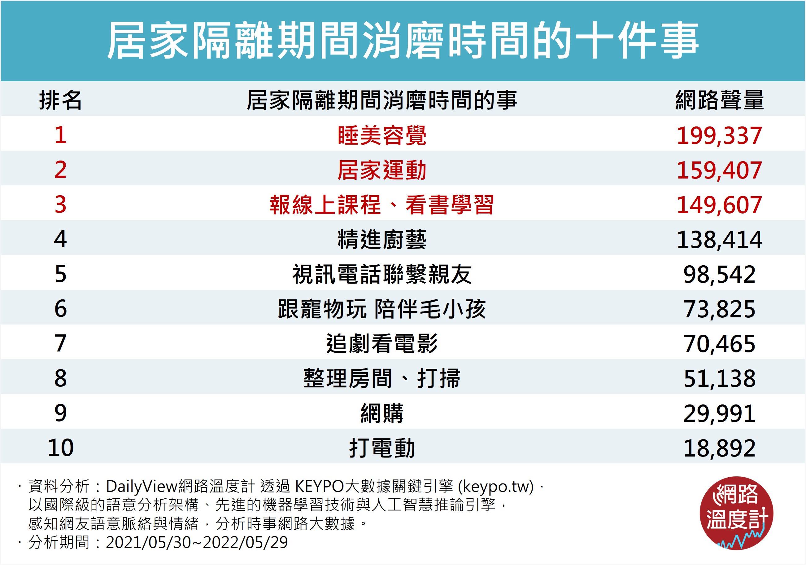 今天《DailyView網路溫度計》就透過《KEYPO大數據關鍵引擎》,盤點了網友熱議在居隔期間可以做的十件事情,相信時間一下就過去了,充實度過你的隔離時光吧!