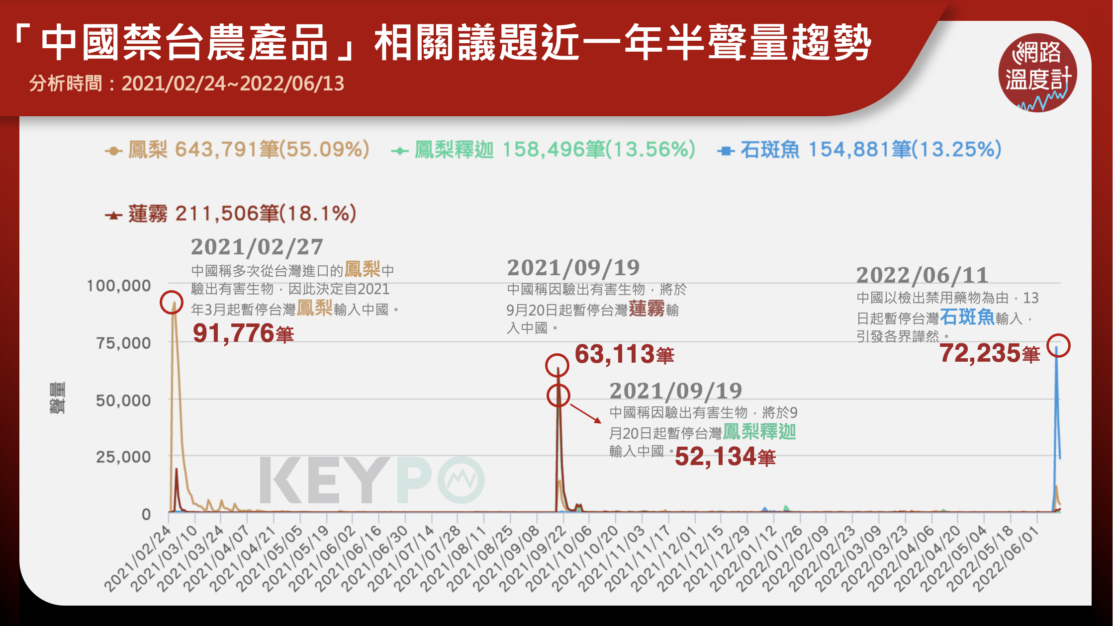 根據《KEYPO大數據關鍵引擎》輿情分析系統(日期:2021/02/24~2022/06/13)統計,去年年初中國突然宣布禁止台灣鳳梨進口,當時造成相當大的震撼,而相關議題的討論度立刻在2021年2月27日衝出聲量高點,而這也是4項被禁的台灣農產品裡面,熱議度最高的農產品,共91,776筆討論。