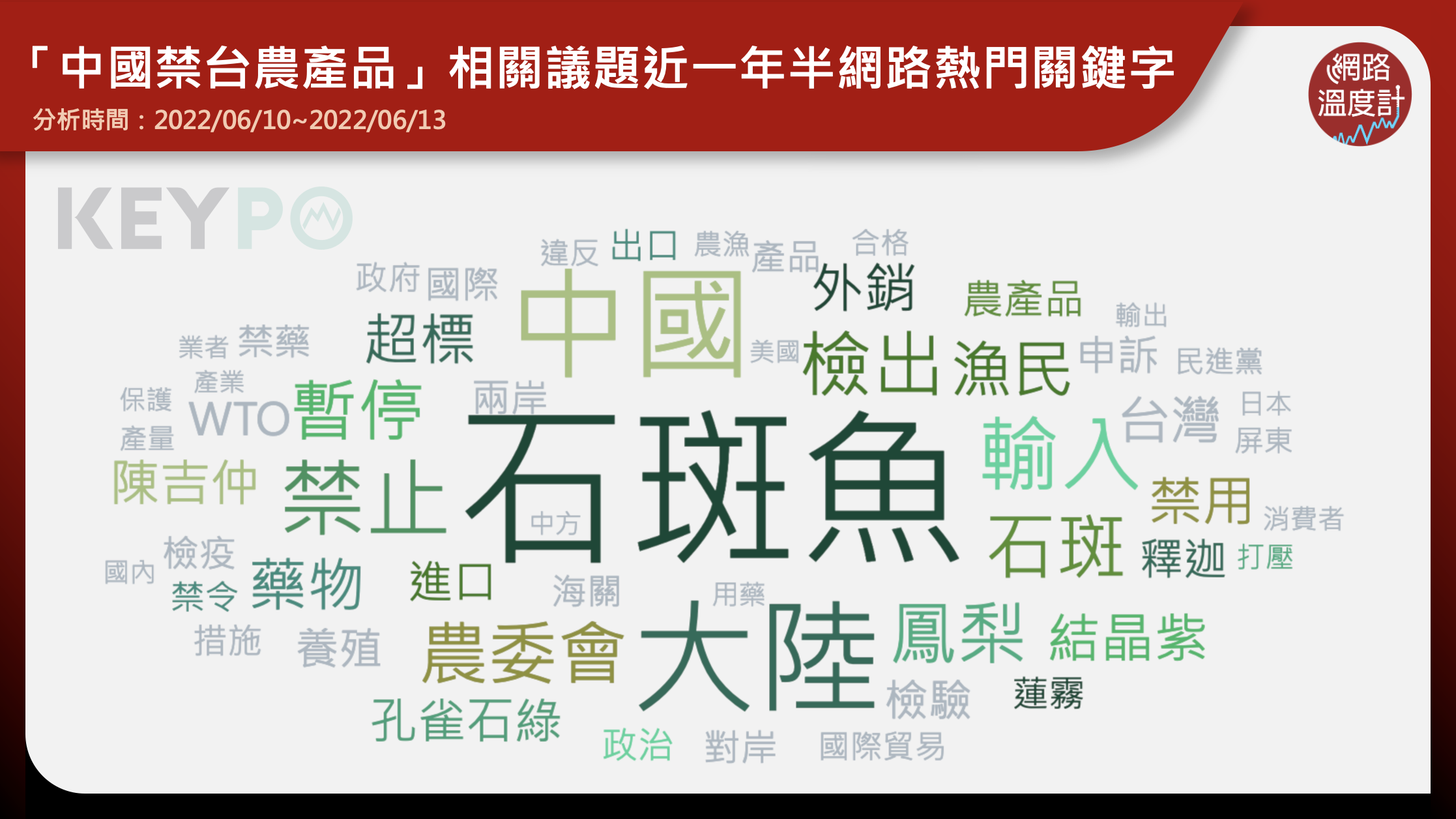 根據《KEYPO大數據關鍵引擎》輿情分析系統(日期:2022/06/10~2022/06/13)統計,網友近期在「中國禁台石斑魚進口」討論度相當高,包括禁用藥物、孔雀石綠、超標、暫停等字詞都登上網路熱門關鍵字。另外,在兩岸議題上,更敏感的還有政治話題,因此不少網友也在討論貿易政策、禁止輸入背後都是政治操作,「政治」一詞的討論也擠進熱門關鍵字榜單。