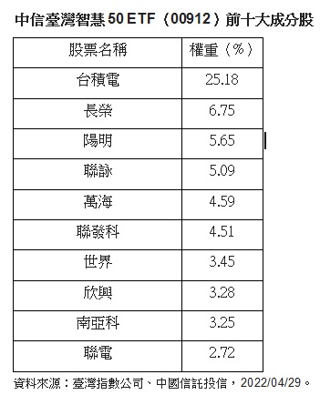 中信臺灣智慧50 ETF(00912)追蹤「特選臺灣智慧50指數」,導入成長、價值、規模、動能、和品質五大量化因子進行個股的權重配置。 隨著全球陸續鬆綁邊界管制和中國逐步解封,帶動5G應用、車用電子、高效能運算等相關晶片需求,預期下半年經濟表現有機會優於上半年,中信臺灣智慧50 ETF(00912)採用多因子投資策略,為投資人捕捉大循環中具潛力的優勢企業,掌握市場風格變化加碼趨勢股,加上台股本益比仍為相對低點建議投資人可分批進場佈局,降低踩雷機率,更要贏在起跑點。