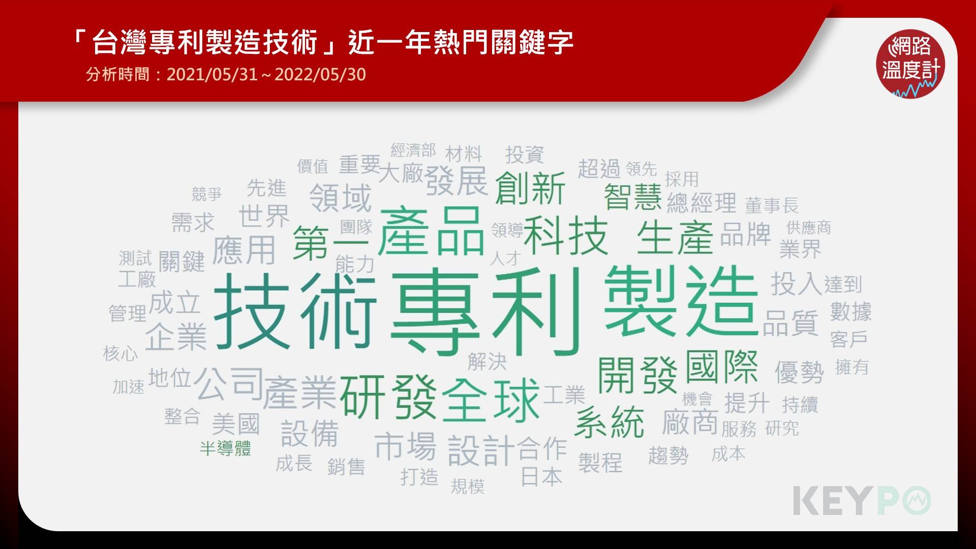 在其中,台灣製造的許多產品,更是有「世界第一」的美譽。諸如科技業的各種電子元件、汽車、單車的零件等等,都大量出口至國外,具有相當高的市佔率。到底台灣的這些製造業大廠,都有什麼厲害的特點,能夠發展出這些優異的成果呢?今天《DailyView網路溫度計》透過《KEYPO大數據關鍵引擎》輿情分析系統,調查出了有關「台灣專利製造技術」的近一年熱門關鍵字,帶你從這些關鍵字看台灣的製造業大品牌,都有什麼能夠立足國際的技術強項!