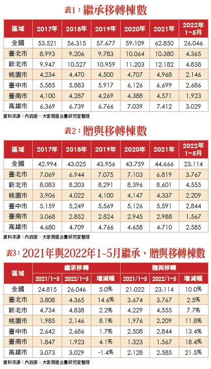 依據內政部統計資料,去(二○二一)年全台一整年繼承案件為六萬二八五○件,而贈與案件為四萬四六六六件,兩者都是逐年增加(表一、二)。另今年一至五月全國繼承件數為二萬六○四六件,較去年同期小幅增加五%,而贈與件數為二萬三一一四件,較去年同期大幅增加一○%,贈與熱度相比繼承案件的增幅多(表三)。