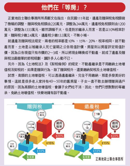 反觀,若是繼承長輩的不動產,除了財產超過今年新公布的一三三三萬元免稅額要繳遺產稅外,若低於一三三三萬元就不用繳遺產稅,也不用繳土增稅、契稅,就遺產傳承的角度來看,「繼承」要比「贈與」的財務規劃來的划算。