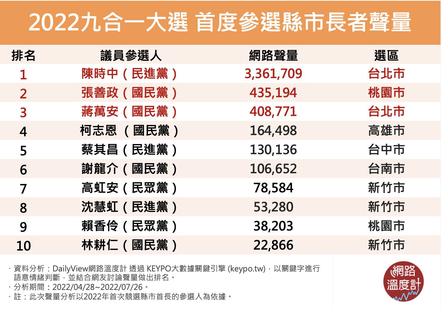 今天《DailyView網路溫度計》透過《KEYPO大數據關鍵引擎》輿情分析系統,統計出2022年所有縣市長新人參選人,最被網友討論的十大人選。你心目中的人選有上榜嗎?