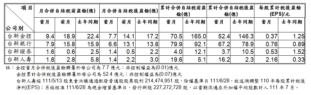 台新金控111年7月自結稅後淨利新台幣7.7億元(含金控取得台新人壽交易合約中的或有價金評價受殖利率上升影響0.25億),累計每股稅後淨利(EPS)0.37元。
