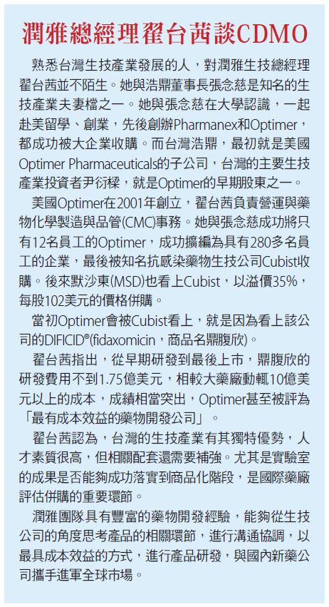 CDMO已成為許多台灣生技公司的訴求重點,潤雅的CDMO有何不同?羅際偉指出,CDMO市場有兩個取向,一是以量取勝,毛利不高但薄利多銷,另一個則是合作開發新世代藥品。潤雅的獲利模式比較適合後者。