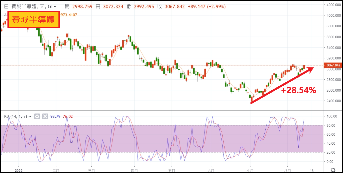 美股四大指數由低點至8/12,道瓊指數上漲4108點(+13.85%)、NASDAQ指數上漲2482點(+23.49%)、S&P指數上漲644點(+17.7%)、費城半導體指數上漲681點(+28.54%)(詳圖二)。