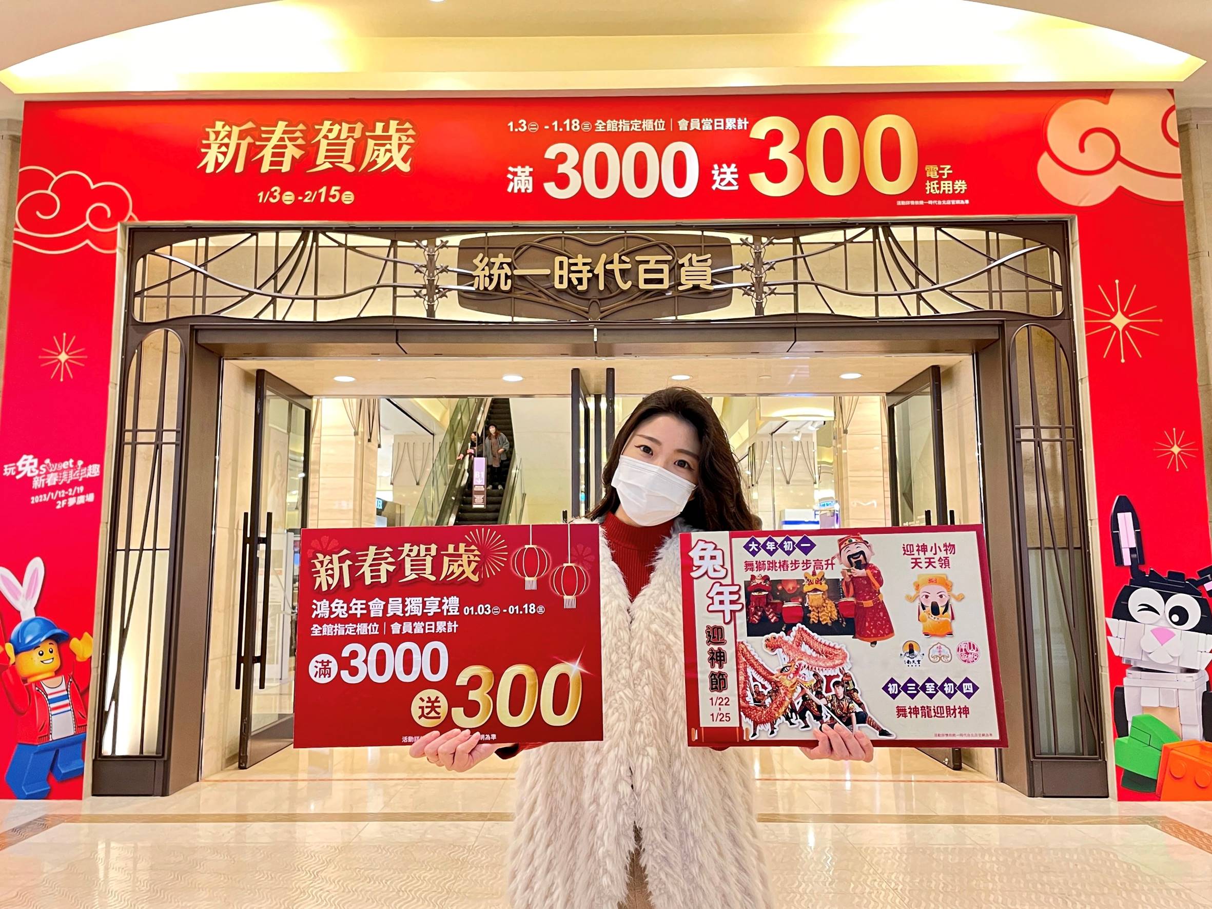 農曆春節即將到來,統一時代百貨台北店迎兔年「新春賀歲」檔期於1/3-1/18盛大開跑,推出全館指定櫃滿3000送300活動,首六日1/3-1/8加碼刷十大指定銀行信用卡,包含玉山銀行、花旗銀行、中國信託商業銀行、台新銀行等享滿額2%、3%、4%抵用券回饋。