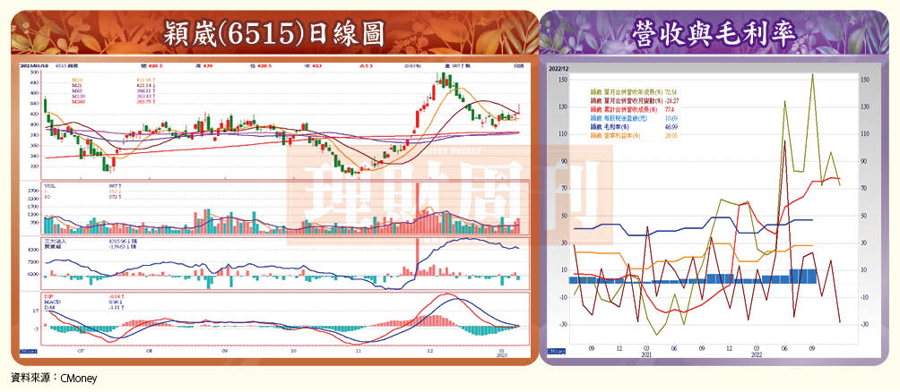 穎崴去年前三季營收三四.一三億元,年增率七五.六六%,毛利率四三.六三%,年增五.○一個百分點,營益率二四.○%,年增七.八五個百分點,稅後純益六.九七億元,年增率一七七.六九%,去年前三季EPS二○.四三元,超越去年同期的一四.四六元。