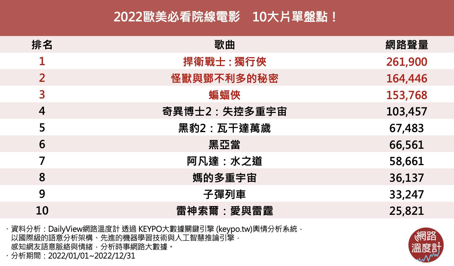 《DailyView網路溫度計》盤點2022一整年有上映台灣院線的歐美電影,透過《KEYPO大數據關鍵引擎》輿情分析系統調查出10部強檔電影,每部都是網友激推必看,快把片單收藏起來,農曆春節時與親朋好友一起觀看吧!
