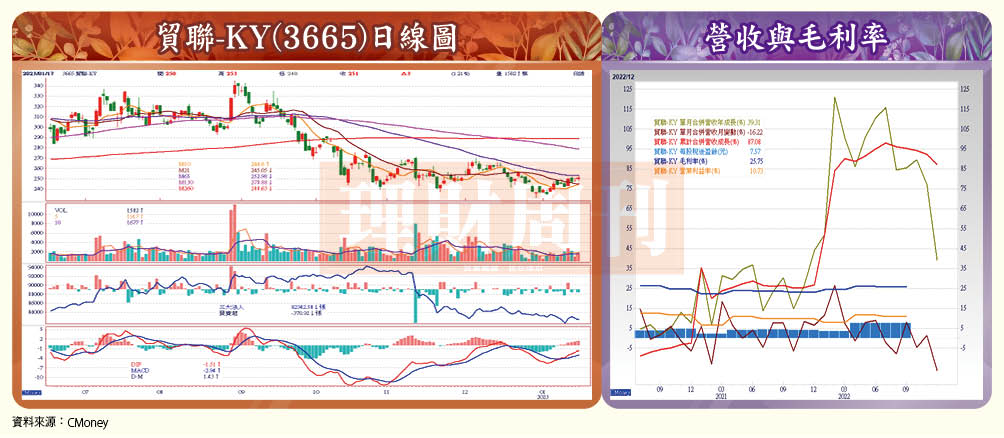 去年以來,貿聯-KY受惠併入工業應用事業群(INBG),因而推升整體營收規模擴增放大,加以長期動能產品(高效能運算、電動車、工廠自動化、資本設備等)營收比重逐漸提升,產品組合日趨有利之下,因此推升營運獲利大幅增加。貿聯-KY去年前三季稅後純益達二九.一六億元,年增率達九八.七○%,前三季EPS達一九.一四元,大賺將近兩個股本。
